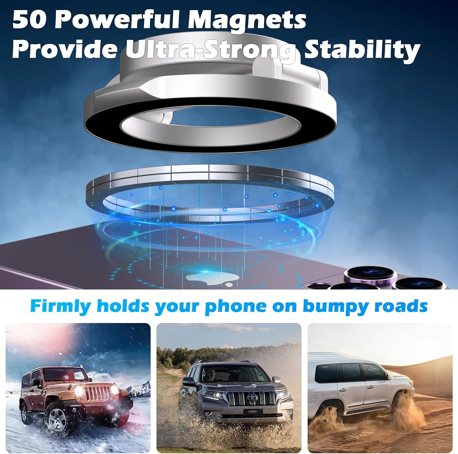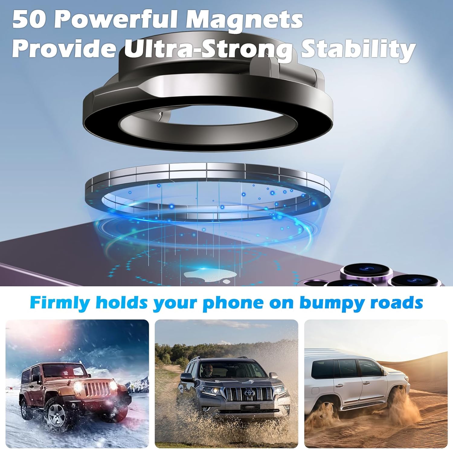 🔘 قوة مغناطيس عالية تمسك الموبايل بثبات حتى في الطرق الوعرة.