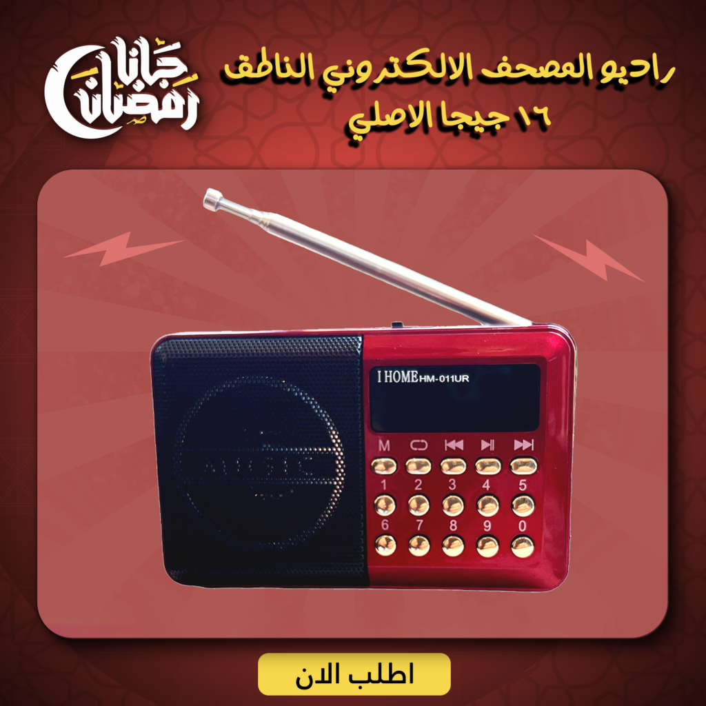 • راديو المصحف الإلكتروني الناطق فيه القرآن الكريم كامل بيشتغل ببطارية موبايل و تقدر تشغل عليه راديو و تقدر تركب فيه هاند فري و فيه أذكار الصباح و المسا
