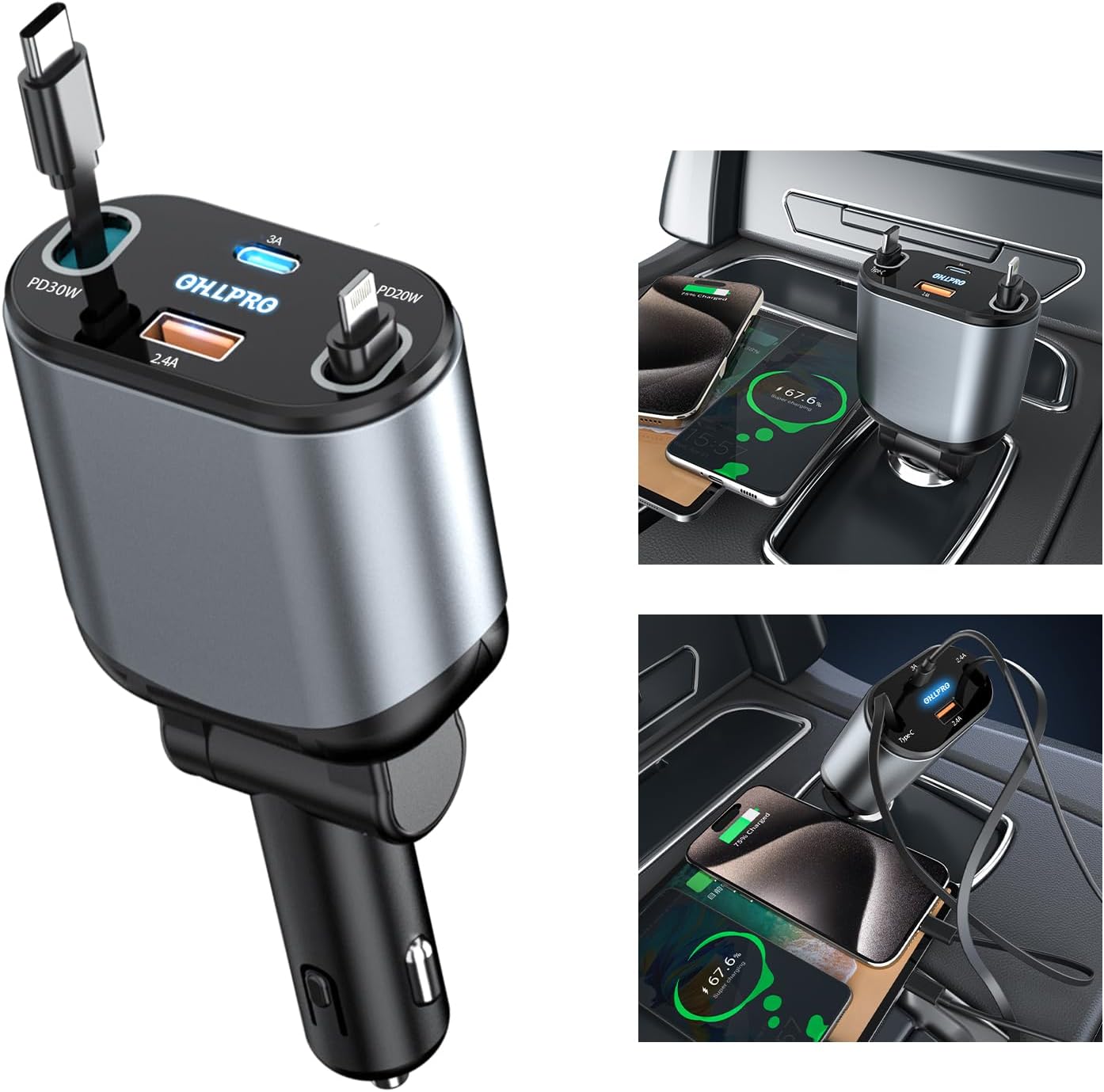 مزود بـ 2 كابل قابل للسحب (Type-C وLightning) + 2 مخرج (USB وType-C)، يعني تقدر تشحن 4 أجهزة مرة واحدة من غير ما تفقد السرعة أو الأداء.