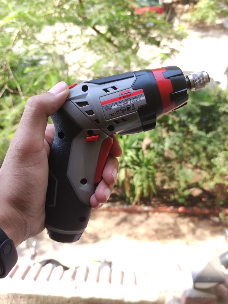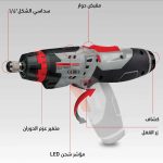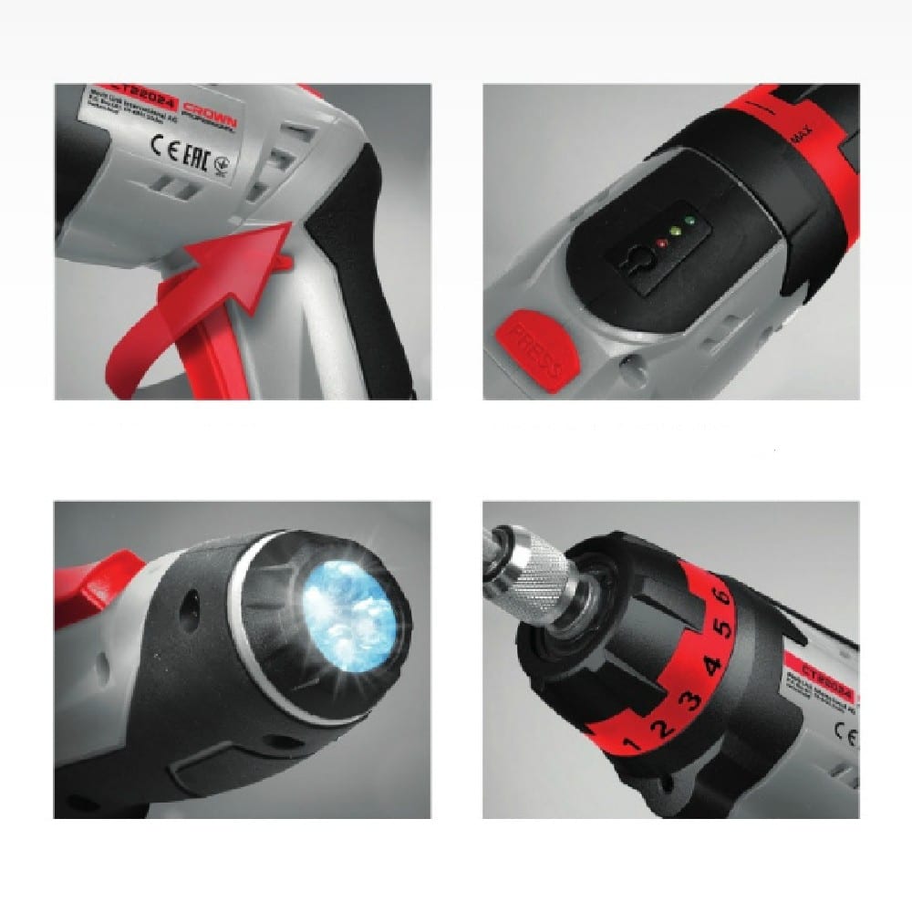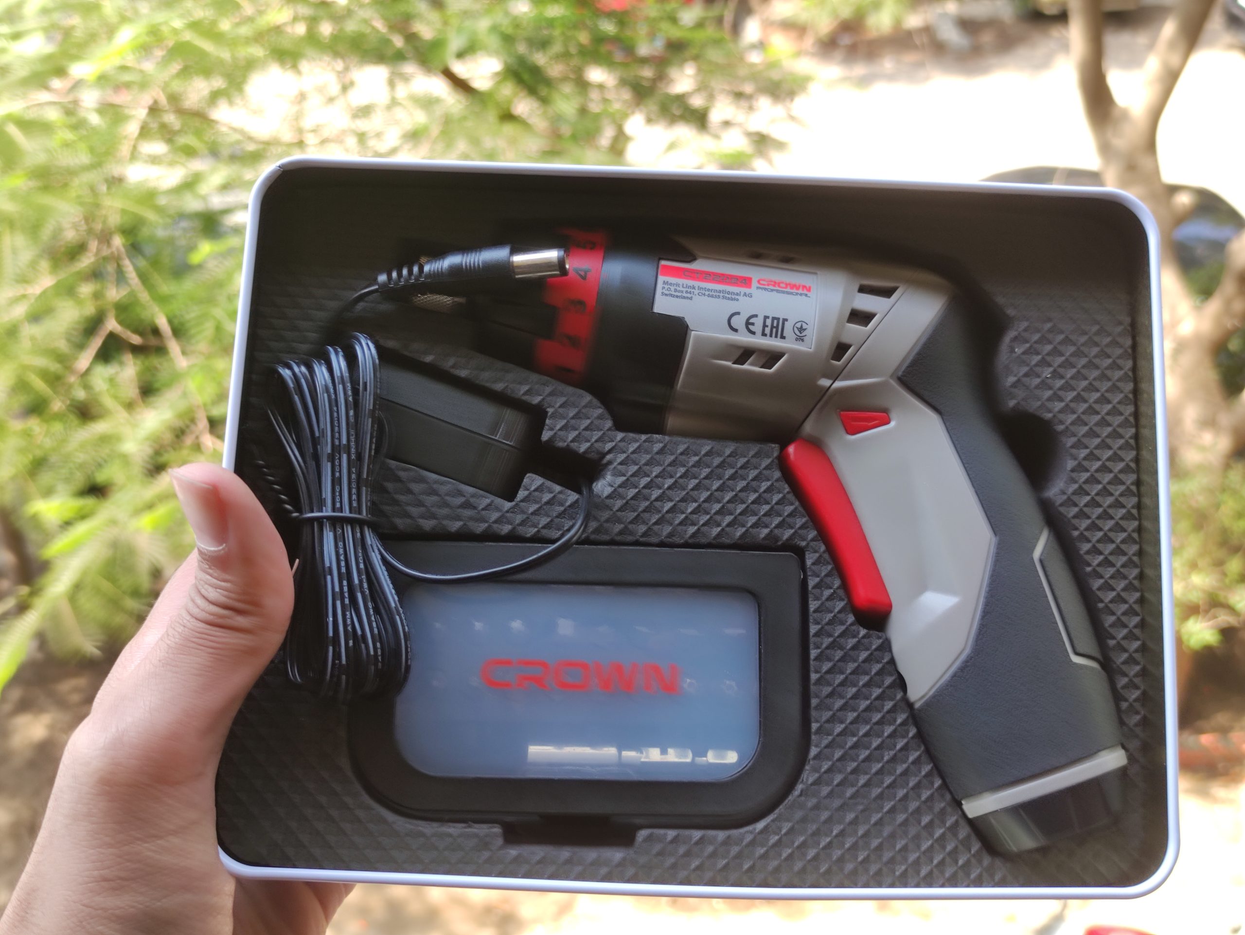 مفك إلكتروني Crown بيربط و يفك وتقدر تستخدمه من غير كهرباء لأنه ببطارية قابلة لإعادة الشحن، المفك فيه كشاف خلفي LED. و كشاف أمامي بيفتح وانت مشغل المفك، المفك قابل للدوران يعني تقدر تستخدمه و هو على شكل مسدس أو تخليه بالطول.