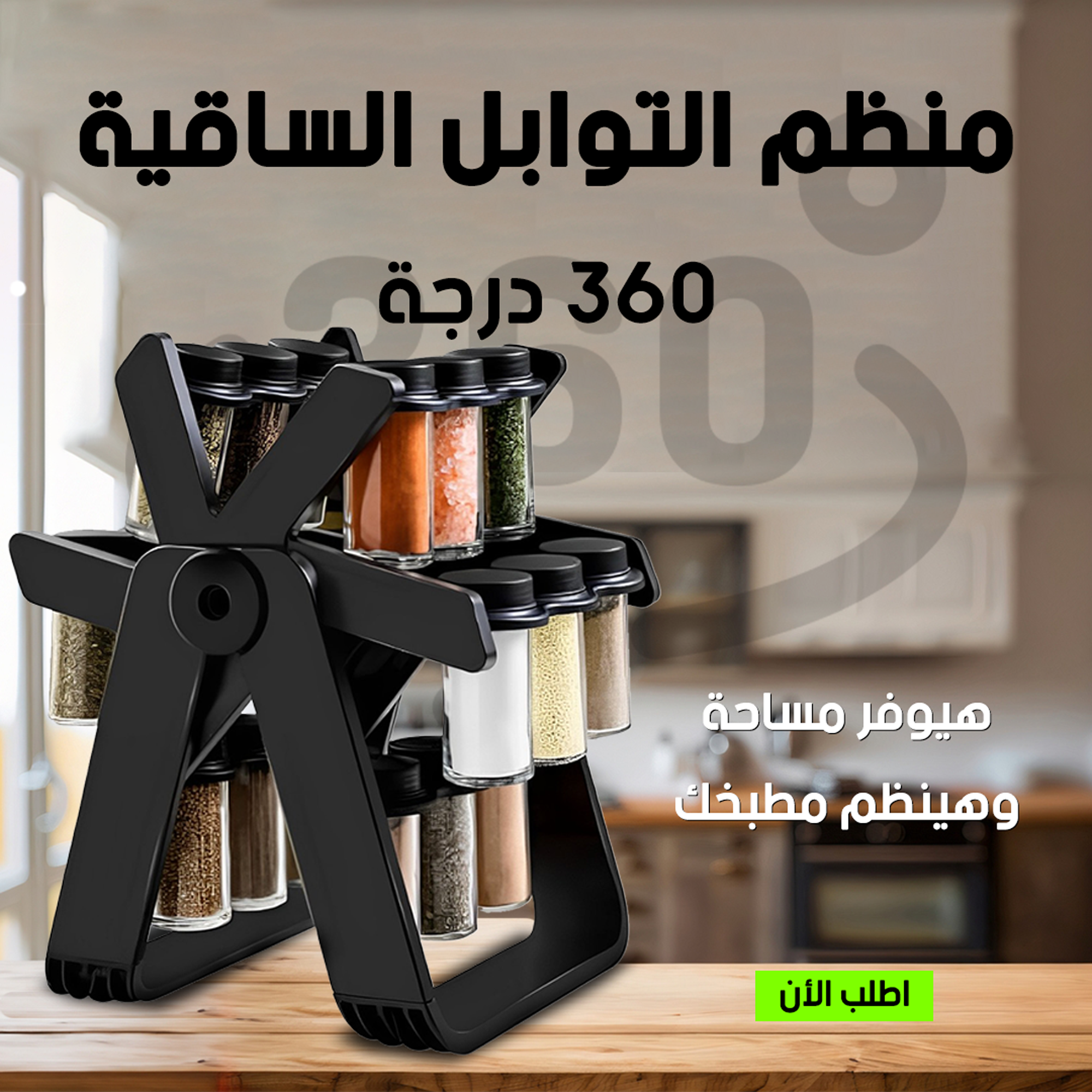 • “كل توابل مطبخك في مكان واحد! منظم التوابل الساقية 360 درجة هي الحل الأمثل لتنظيم مطبخك، ويوفر لك سهولة الوصول إلى كل التوابل بلمسة يد.”