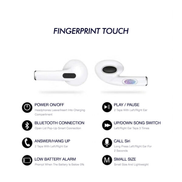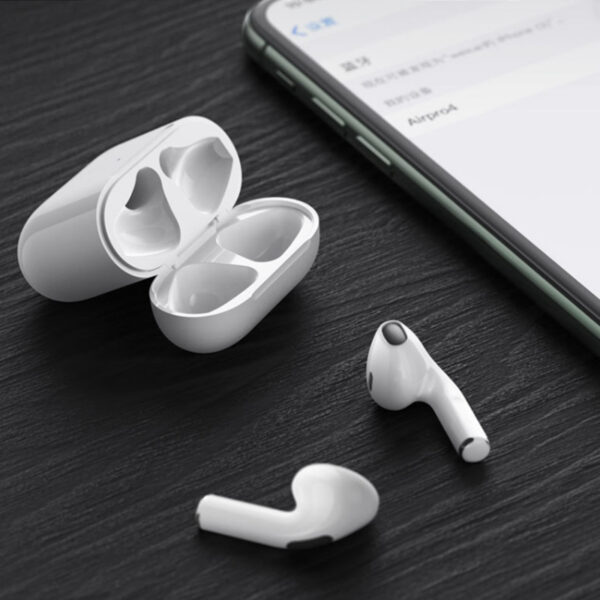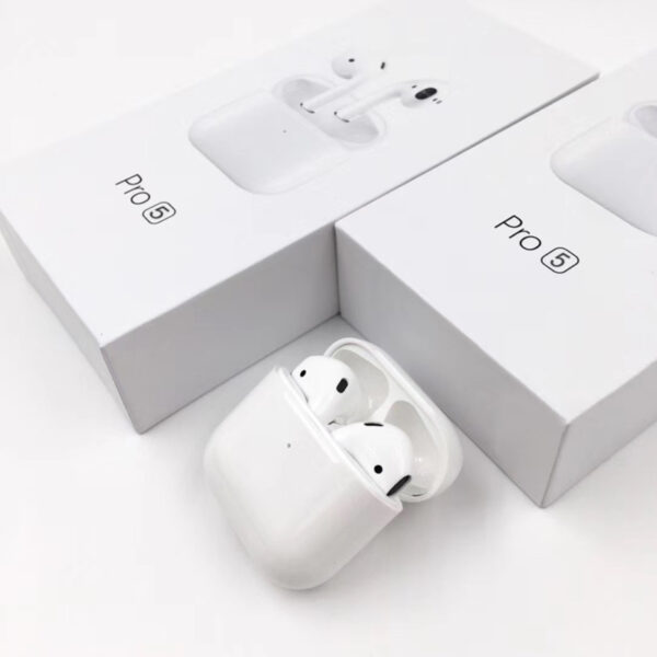 سماعة أيربودز برو 5 لونها أبيض صوتها عالي و واضح و خفيفة الوزن و بتدعم نظام الأندرويد و IOS.