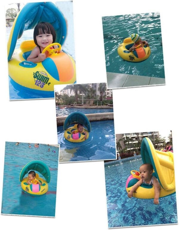 مزود بغطاء شمس خفيف علشان تحمي الطفل من أشعة الشمس أثناء اللعب في حمام السباحة أو على البحر.