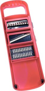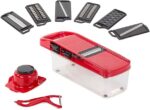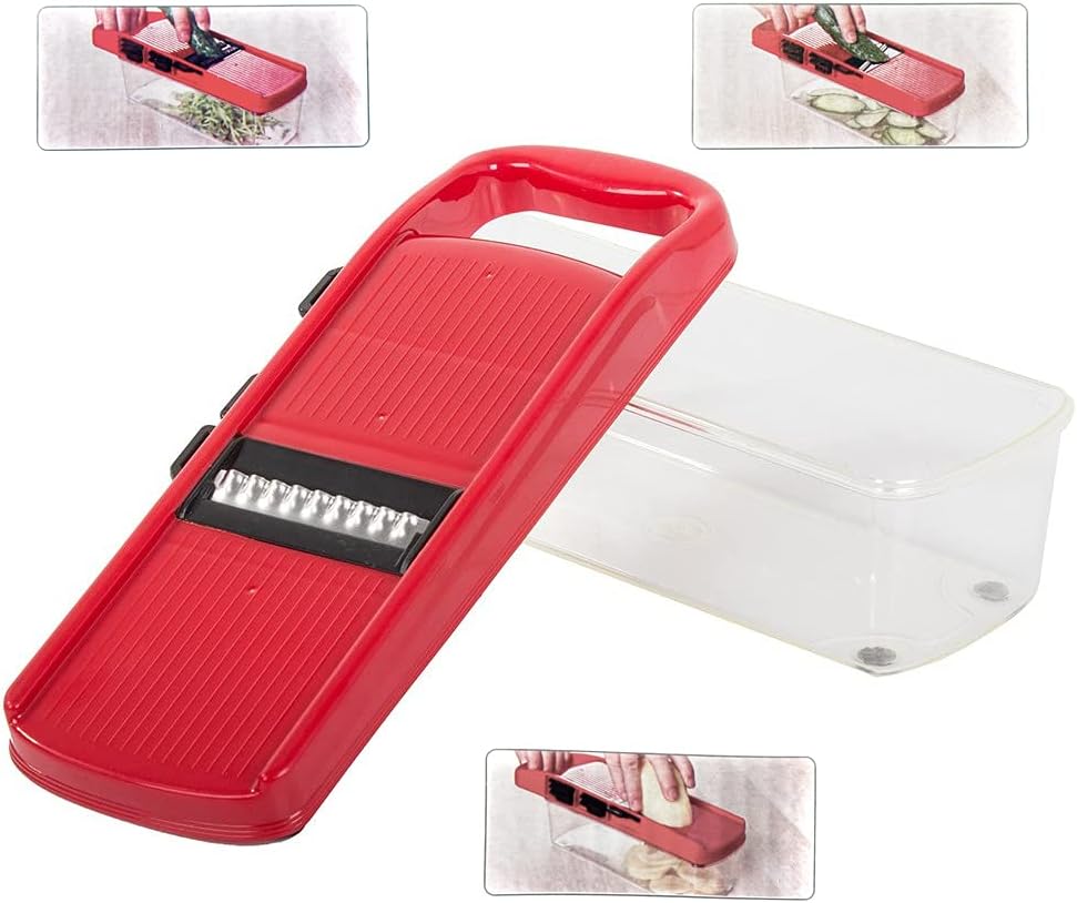 تحتوي على 6 شفرات متعددة الاستخدامات لتقطيع الخضار، بشر الجبنة، تقطيع البطاطس، وتقطيع الفواكه.