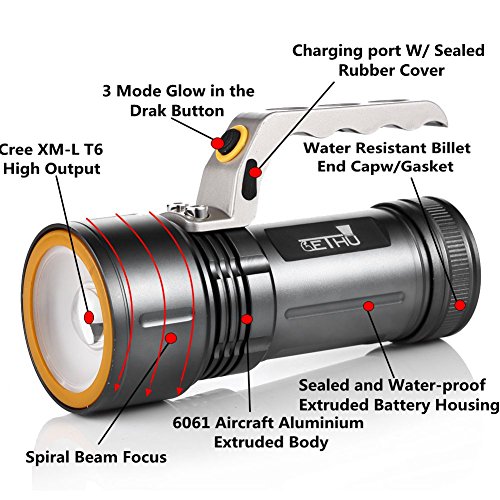 كشاف بيد بزوم السحري – 8000 لومن كحد أقصى – قابل لإعادة الشحن – عمر خدمة LED: أكثر من 100000 ساعة – جهد التشغيل: 4.2 فولت – اول ضغطة = أضأه قوية , ثاني ضغطة = أضأه ضعيفة , ثالث ضغطة = أضأه متغيرة – الوزن: 308 جرام – الأبعاد: 6.7 سم * 9.5 سم * 15.3 سم – لها مقبض لتسهيل المسك – يتم وضع زر الطاقة في مكان استراتيجي لتسهيل المسك- به تكبير لتركيز الضوء أو نشره – مكان الشحن في المقبض