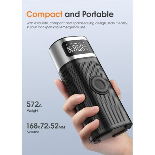 تشحنها مرة وتكفيك تستخدمها كذا مرة، وكمان تقدر تشحن منها موبايلك لو احتجت – يعني كومبروسر وباور بانك في جهاز واحد.