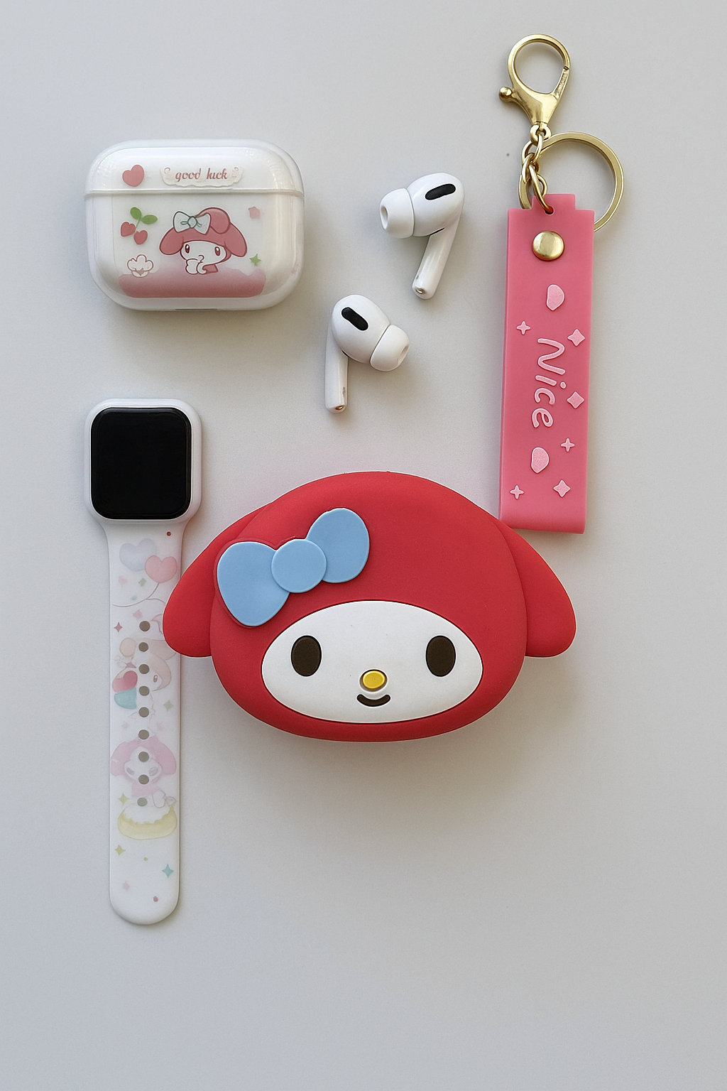 الطقم مزود بإكسسوارات صغيرة تضيف لمسة جمالية زي ميدالية وجه كيتى وميدالية أرنب بفيونكة، تعبر عن شخصية مرحة ولطيفة.