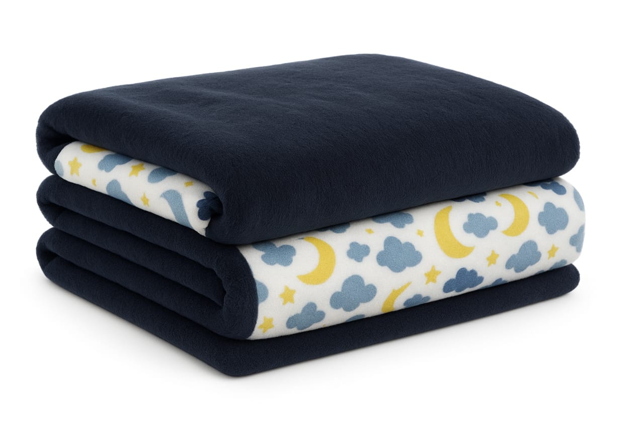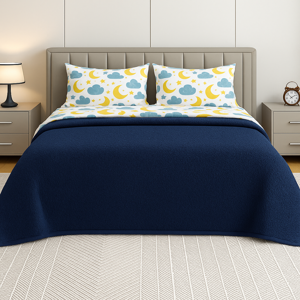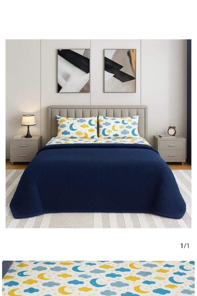دفا وأناقة في لحاف واحد! ❄️🛏️ وش فرو كحلي أنيق + وش مطبوع سحاب وقمر، يقلب ديكور الأوضة ويخليك تنام دافي ومبسوط طول الليل.