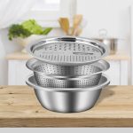 • طقم استانلس مبتكر وعملي مكون من 3 منتجات بمقاس 26 سم: مصفاة استانلس، مبشرة متقسمة لأربع أشكال مختلفة لبشر مختلف أنواع الخضروات بمقاسات متنوعة، و بولة كبيرة للسلطات أو تتبيل اللحوم والمشويات.