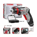 مفك إلكتروني Crown بيربط و يفك وتقدر تستخدمه من غير كهرباء لأنه ببطارية قابلة لإعادة الشحن، المفك فيه كشاف خلفي LED. و كشاف أمامي بيفتح وانت مشغل المفك، المفك قابل للدوران يعني تقدر تستخدمه و هو على شكل مسدس أو تخليه بالطول.