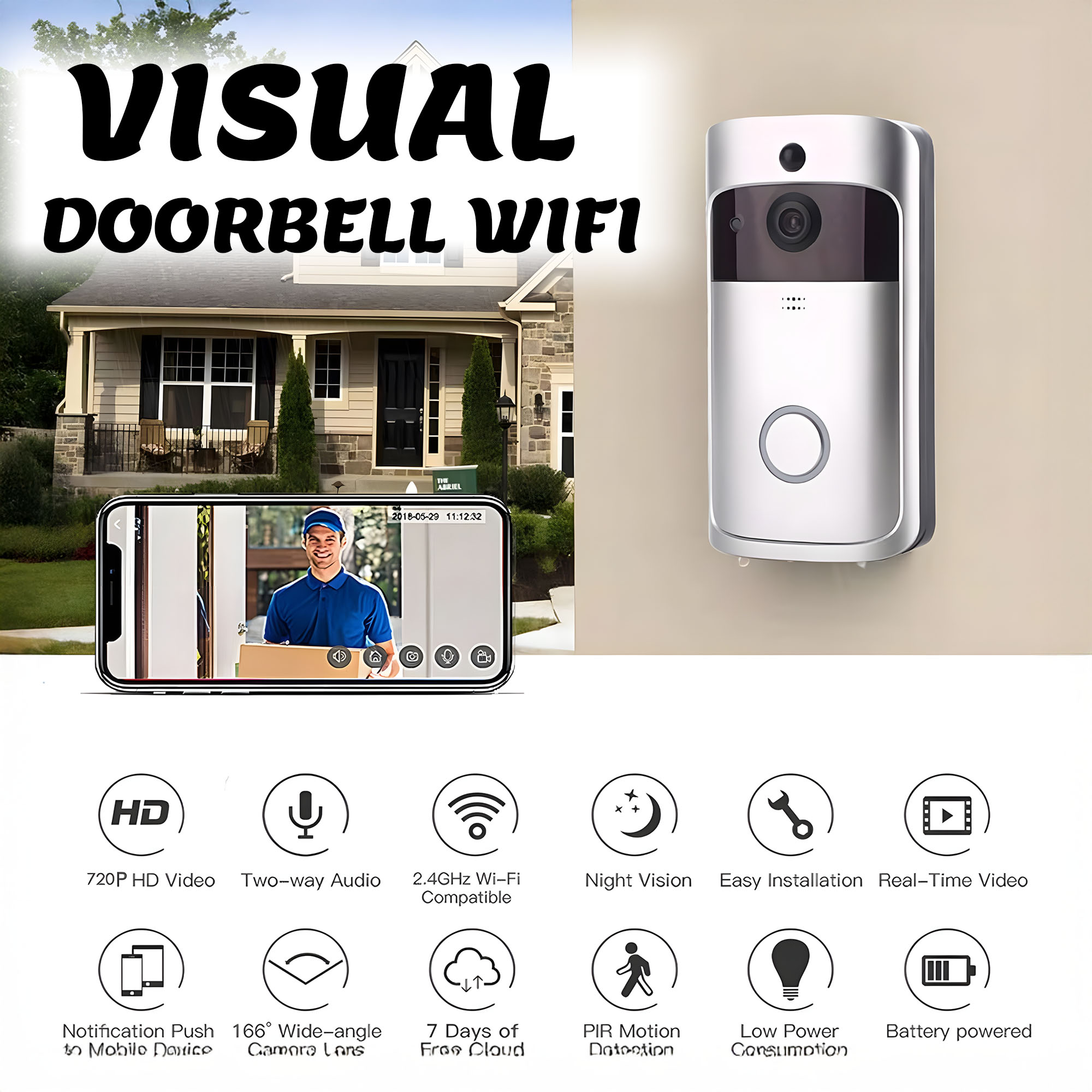 “خلك دايمًا على علم بمن يطرق بابك، حتى لو ما كنت فالبيت! جرس الباب الذكي Visual Doorbell WiFi يعطيك راحة بال وأمان فكل وقت ومكان. 🏡📱”راحة بالك تبدأ من باب بيتك! 📹🔔