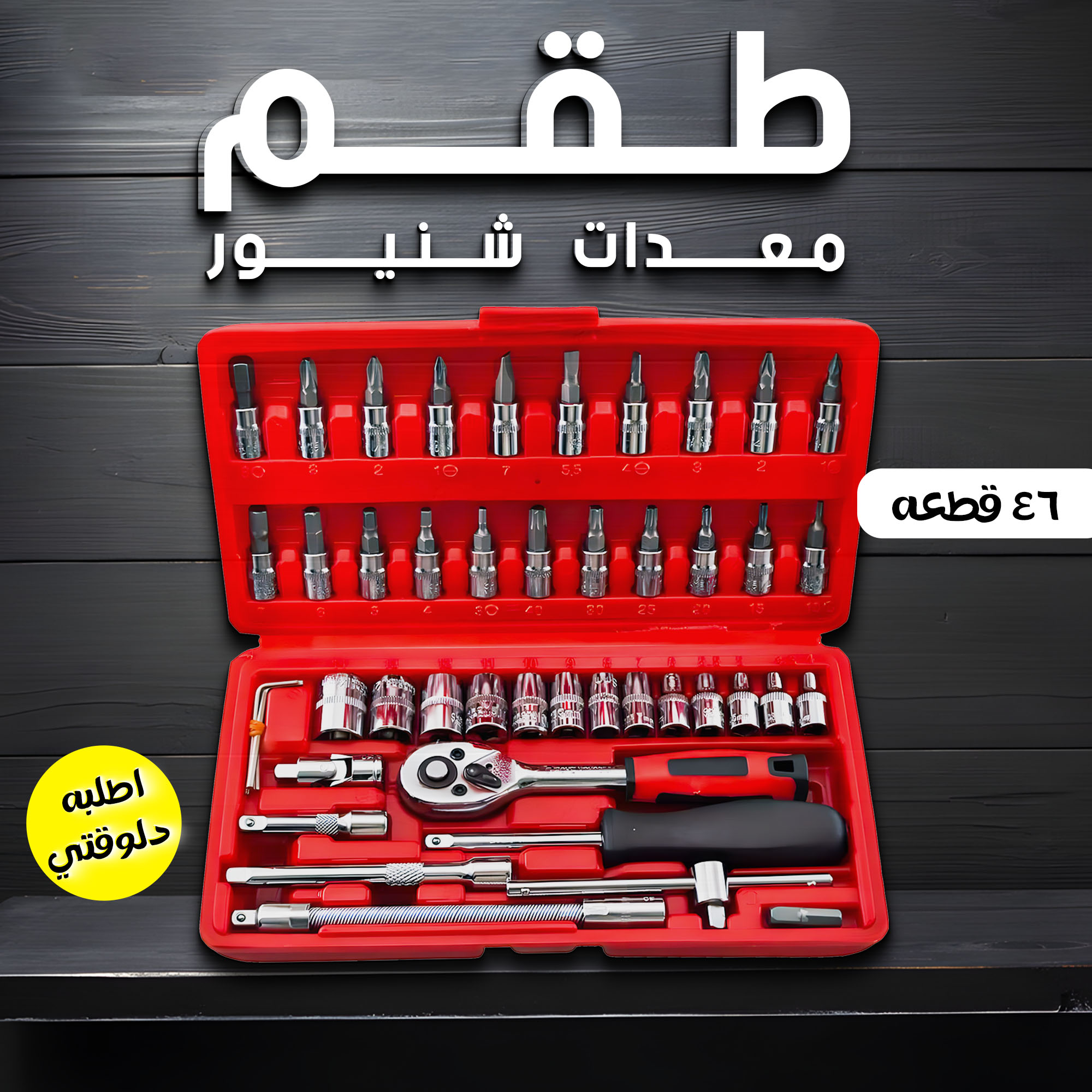 • “طقم معدات شنيور 46 قطعة 💪🔧، كل اللي تحتاجه في مكان واحد! سواء في البيت أو الورشة، هيساعدك في كل أعمال التصليح بسهولة وكفاءة! 🏠🛠️”