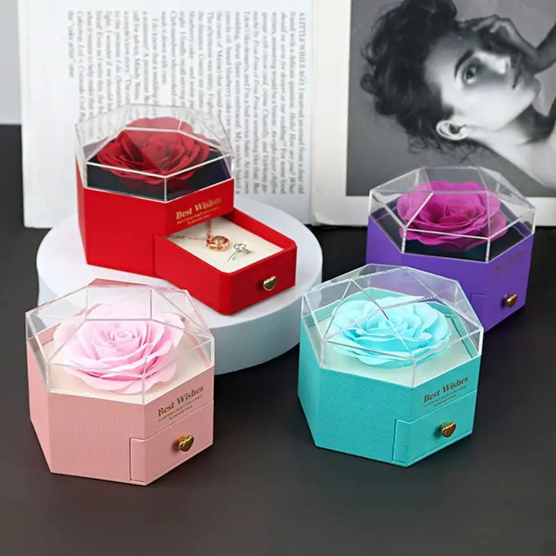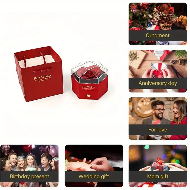 • مش بس ورد! البوكس مزود بدرج صغير محطوط فيه خاتم و ممكن تحطي فيهالهدايا زي المجوهرات أو الهدايا التذكارية، وده بيخلي البوكس استخدامه ممتد وعملي .