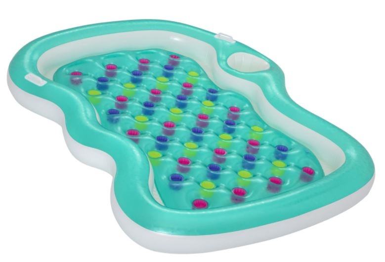 • – تصميم العوامة على شكل سرير وفيه مكان مخصص تحط فيه المشروبات لزيادة الاستمتاع في البحر والبيسين