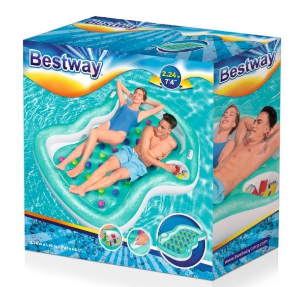 عوامة على شكل سرير للكبار من ماركة Bestway المعروفة عالمياً بجودة منتجاتها، تصميم جديد لشخصين أو أكتر لحد وزن 180 كيلو، بمكان مخصوص للمشروبات لزيادة المتعة في البحر أو حمام السباحة.