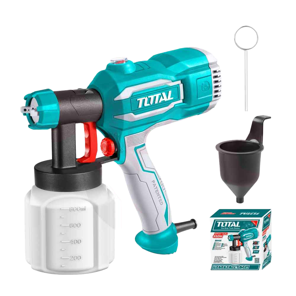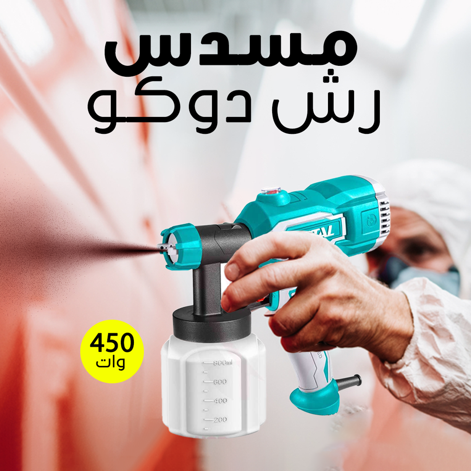 • مش عايز تتعب في الدهان بالفرشاة؟ مسدس رش دوكو 450 وات من توتال هو الحل الأمثل، بضغطة زر هتقدر تغطي مساحات كبيرة بسرعة وسهولة، ونتيجة تحفه تضمن لك دهان متوزع كويس .