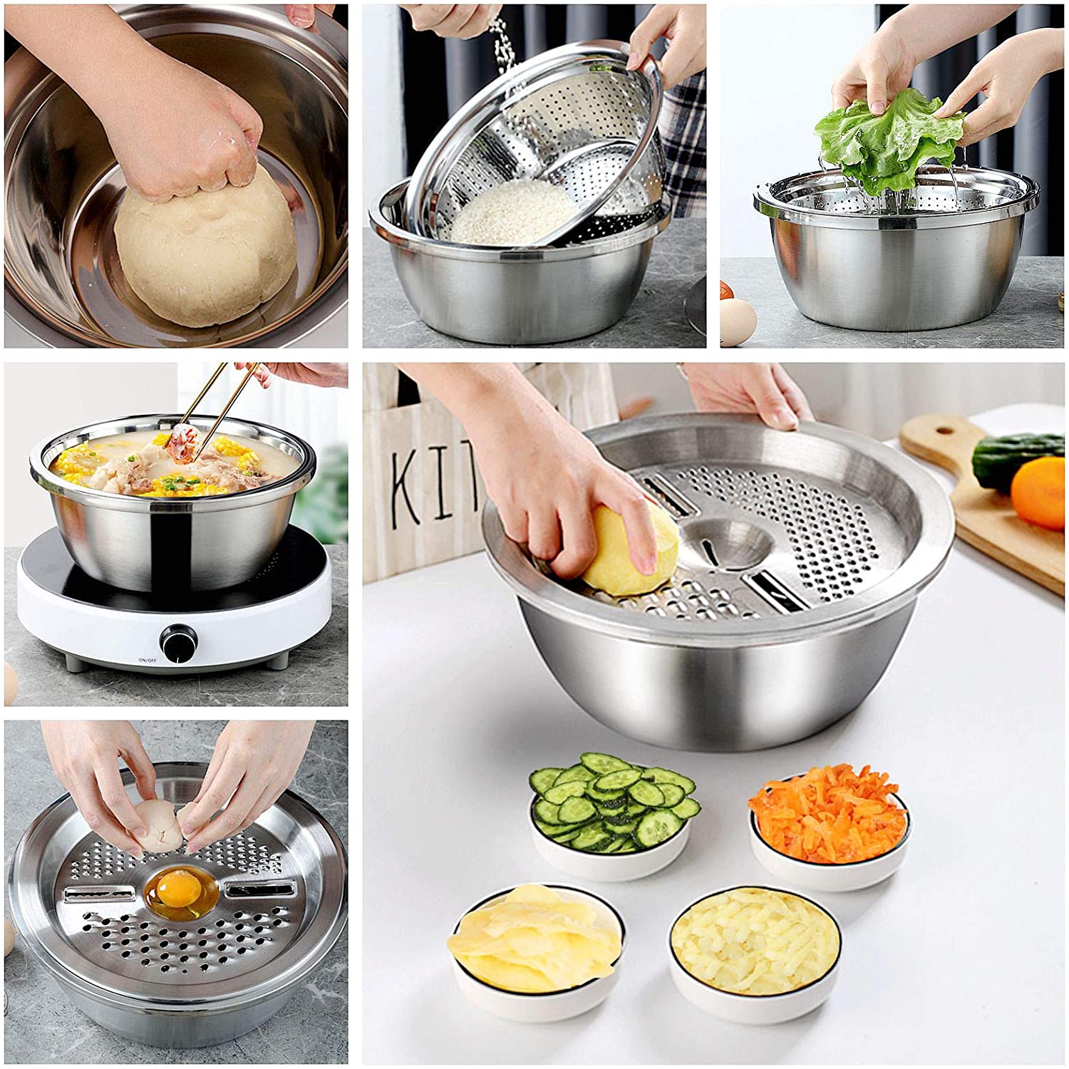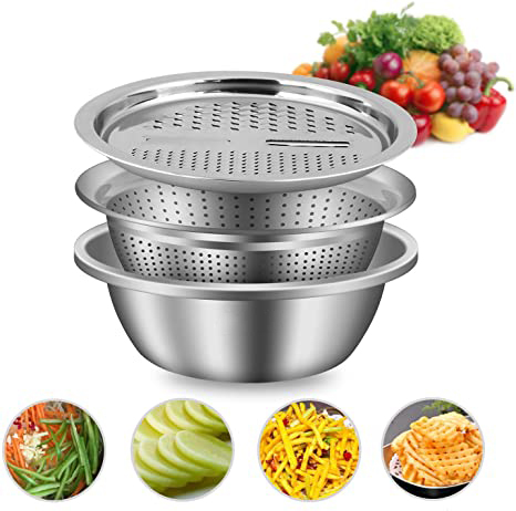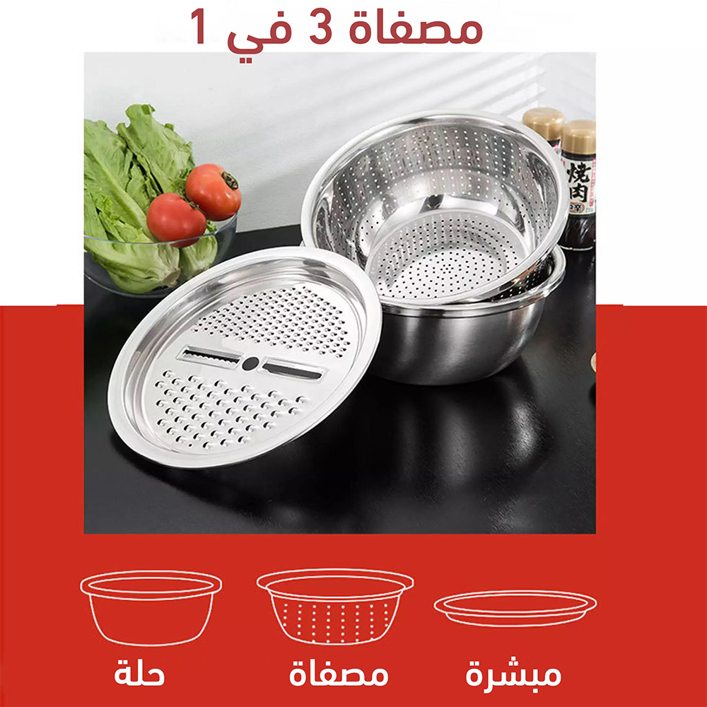 • طقم استانلس مبتكر وعملي مكون من 3 منتجات بمقاس 26 سم: مصفاة استانلس، مبشرة متقسمة لأربع أشكال مختلفة لبشر مختلف أنواع الخضروات بمقاسات متنوعة، و بولة كبيرة للسلطات أو تتبيل اللحوم والمشويات.
