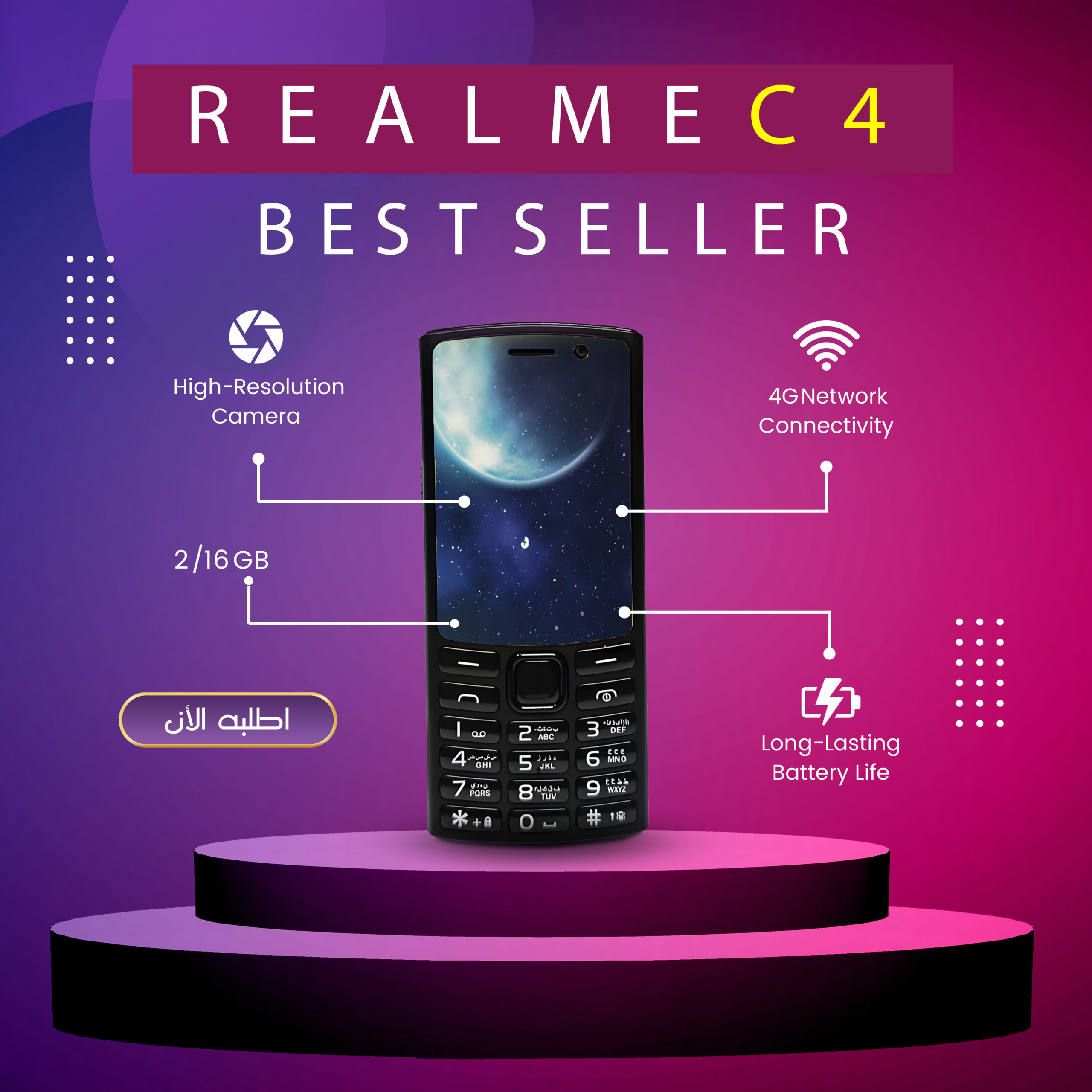 • موبايل C4: مزيج ما بين التاتش والزراير في تصميم واحد! 🖐️📞 استمتع بتجربة الجيل الرابع مع بطارية قوية ومساحة تخزين كبيرة. دلوقتي كل اللي محتاجه بين إيديك! 🚀✨