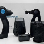 ● محتويات العلبة: جهاز CHIROGUN، محوّل/شاحن، قاعدة شحن، حقيبة تخزين، كيس للرؤوس، ومجموعة رؤوس متعددة.
