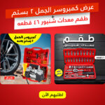 كمبروسر الجمل 2 بستم، يملالك الكاوتش في ثواني وبدون مجهود! 💥💪 ومعاه طقم شنيور احترافي 46 قطعة هيساعدك في أي تصليح بسهولة وكفاءة! 🚗🛠️– جاهز لأي طوارئ أو تصليح في لحظة! 🔧🐫💨