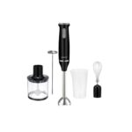 وحدة المحرّك + ساق الخلط + كوب مدرّج + كَبّة مع سكين ستانلس + مضرب + فَوّار + دليل استخدام.