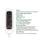 كل الوظائف تتحكم بيها من الريموت: وقت الجلسة (10–20–30 دقيقة)، اختيار الوضع، شدّة المساج، الإيقاف المؤقت، وزر التشغيل والإيقاف. هذا يخليك تتحكم وانت متمدّد من غير ما تتحرك.​