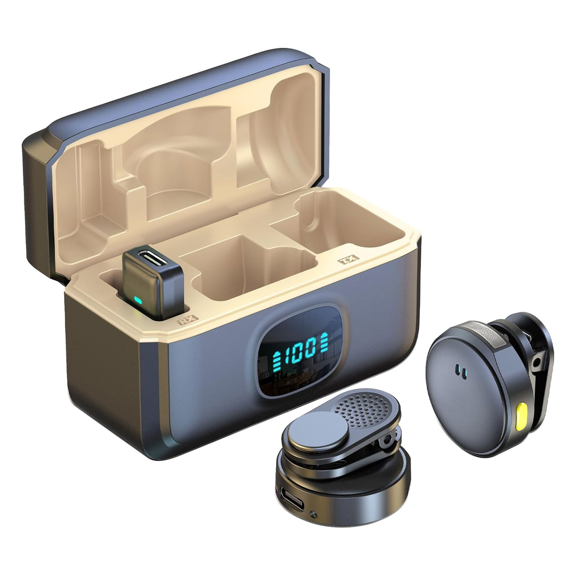 • علبة الشحن تقدر تشحن الميكروفون 5 مرات إضافية، ما يخليك جاهز دايمًا.