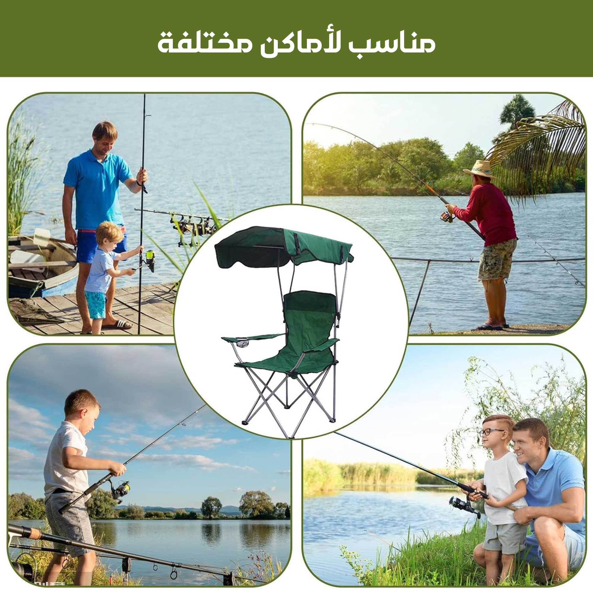 • رفيقك الأمثل لطلعات البر والرحلات البحرية، كرسي مريح مع ظلة متينة.