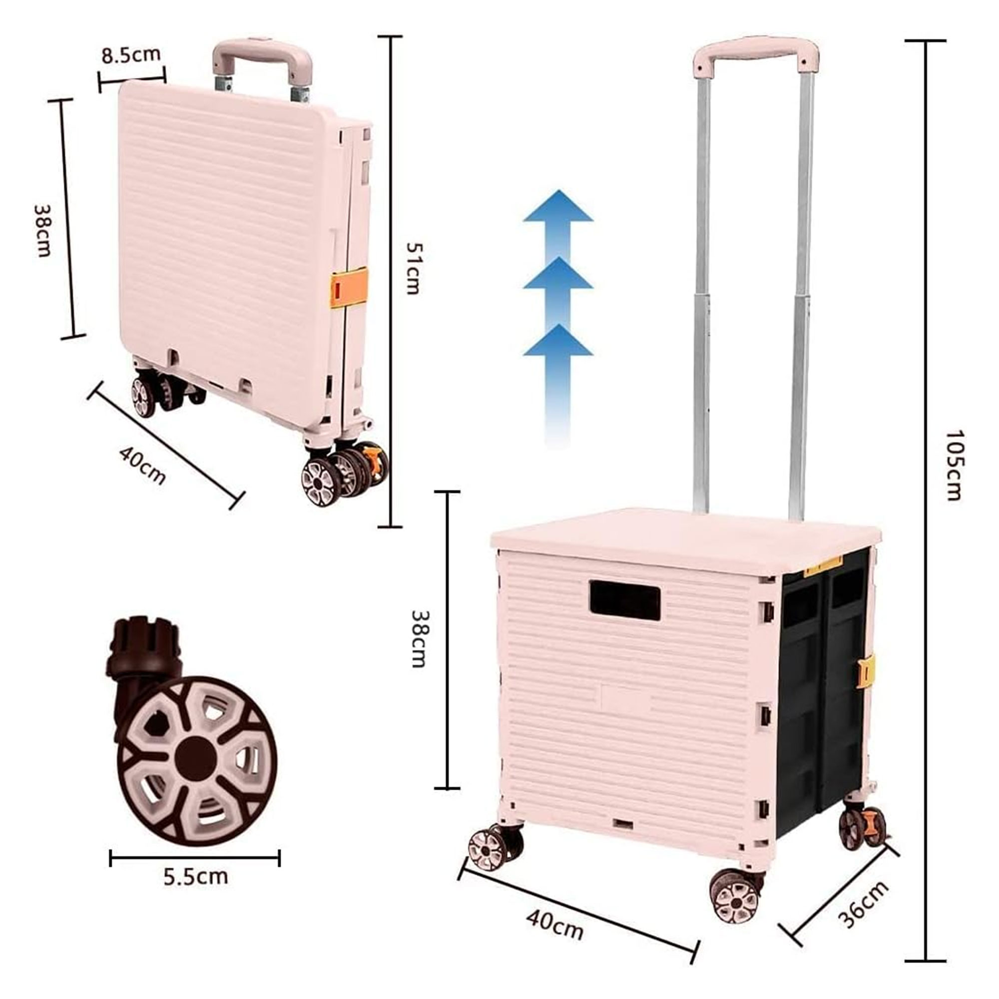 المادة: بلاستيك بولي بروبلين + مقبض ألمنيوم + عجلات مطاط مرن
