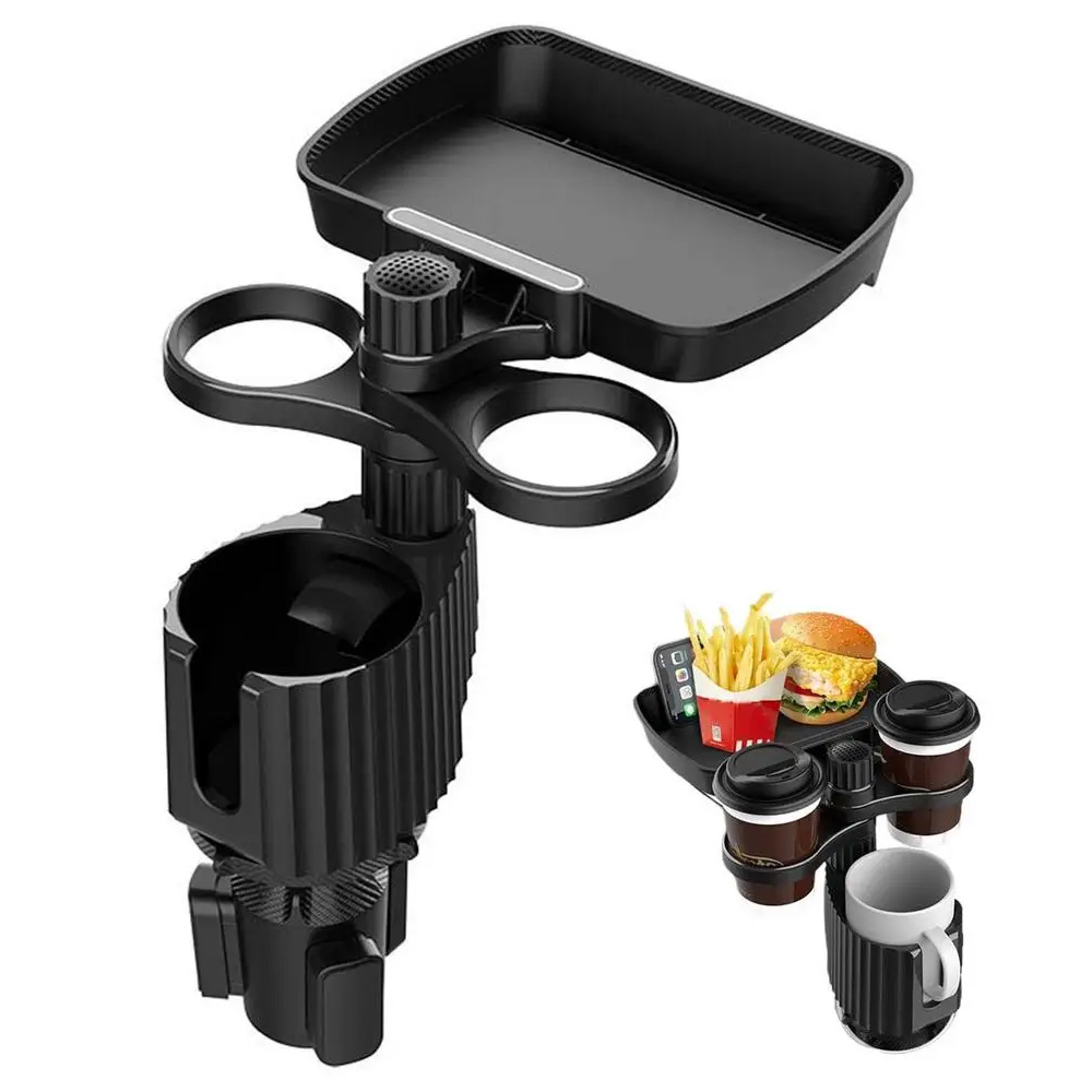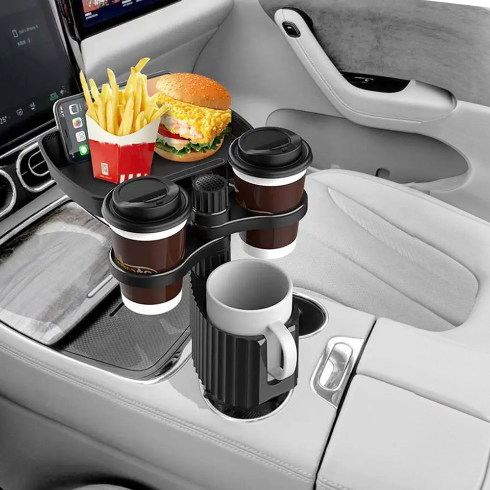 فيه حاملين أكواب وصينية أكل وحامل جوال عملي.