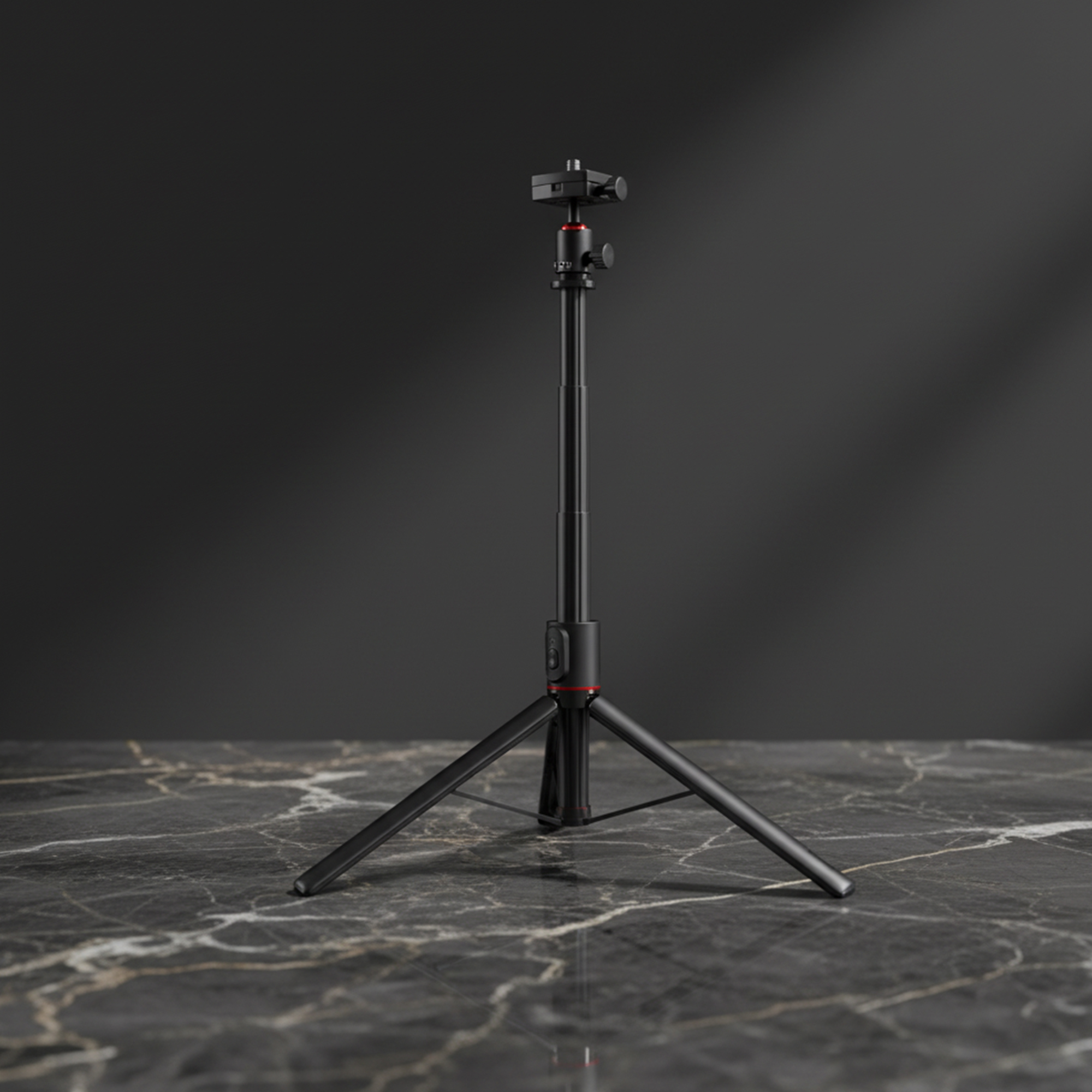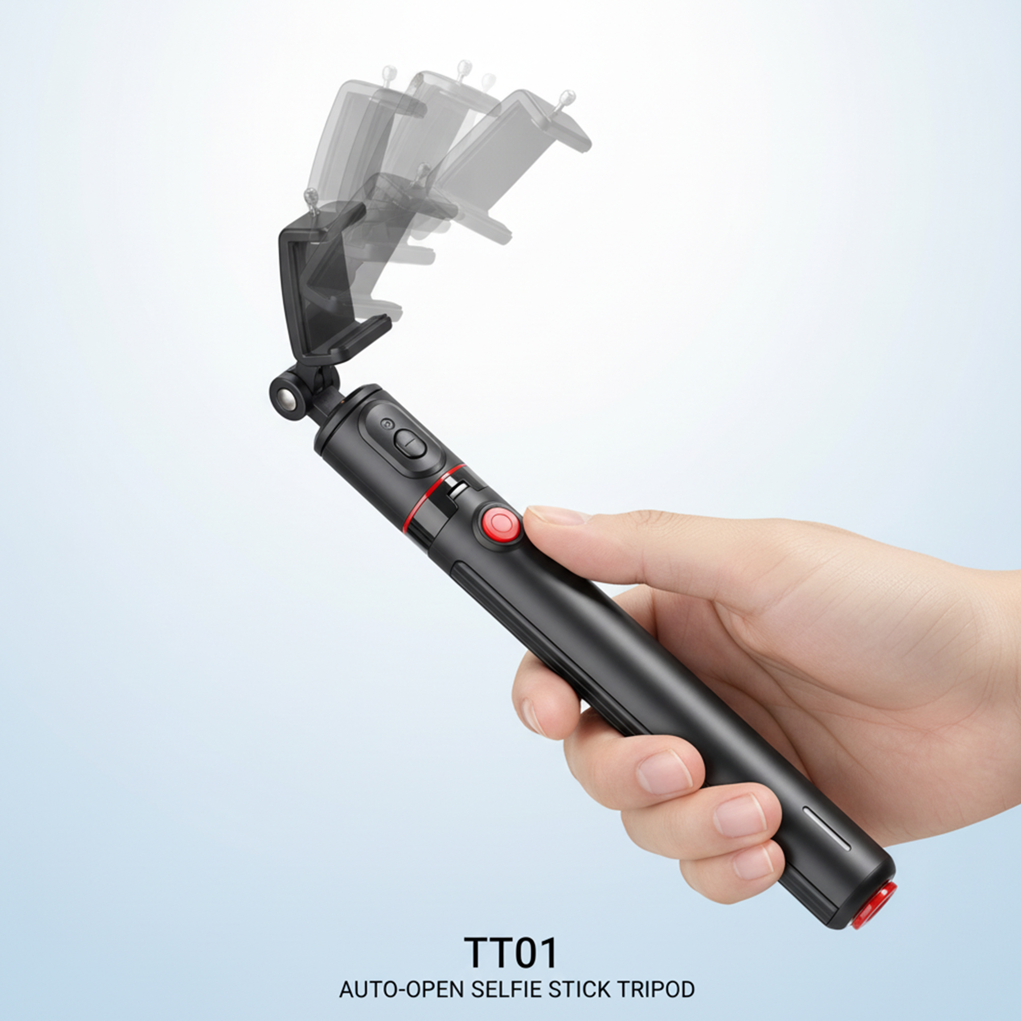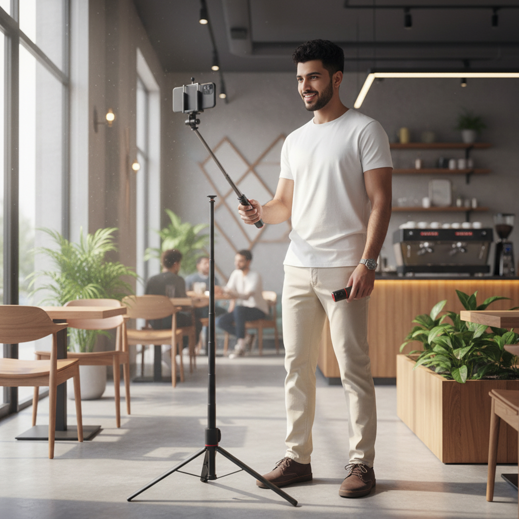 تفك الحامل وتفتحه تلقائيًا، تثبت الجوال بالمقاس المناسب، تشغل البلوتوث وتربط الريموت، ثم تبدأ التصوير عن بعد بسهولة.