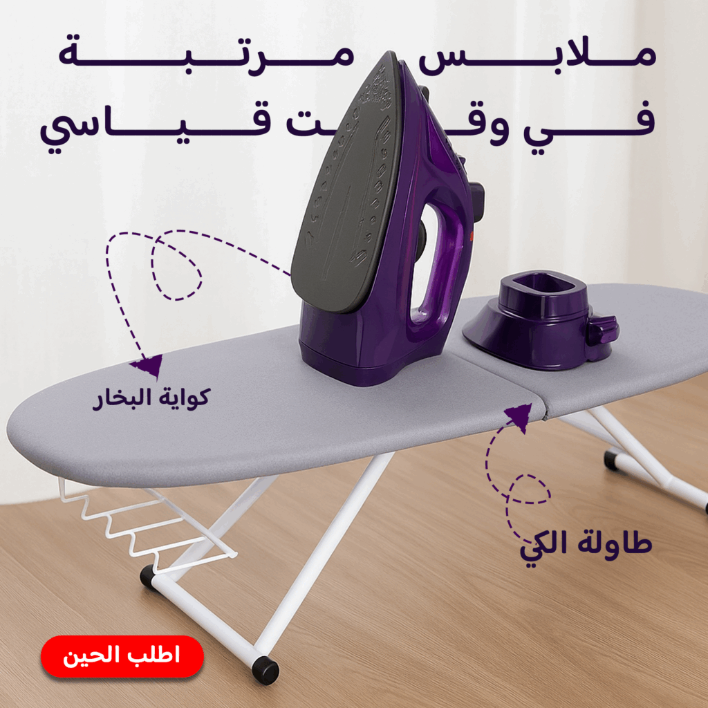 • ما تحتاج طاولة إضافية أو مكان خاص للمكواة، كل شي يكون مرتب بمكان واحد.