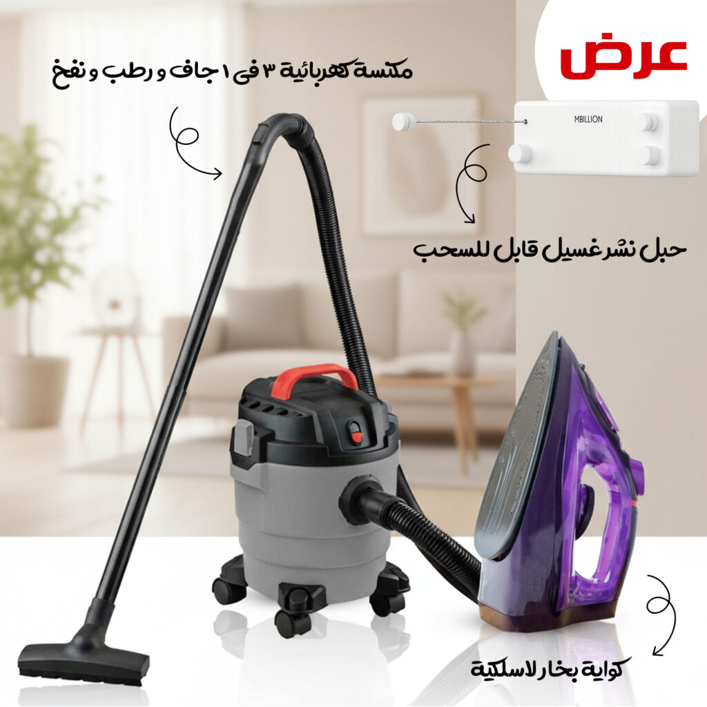 عرض مكنسة للتنظيف الجاف و الرطب 12 لتر بضمان عامين 1200 واط+ حبل نشر غسيل قابل للسحب بضمان عامين + كواية بخار لاسلكية بضمان عامين