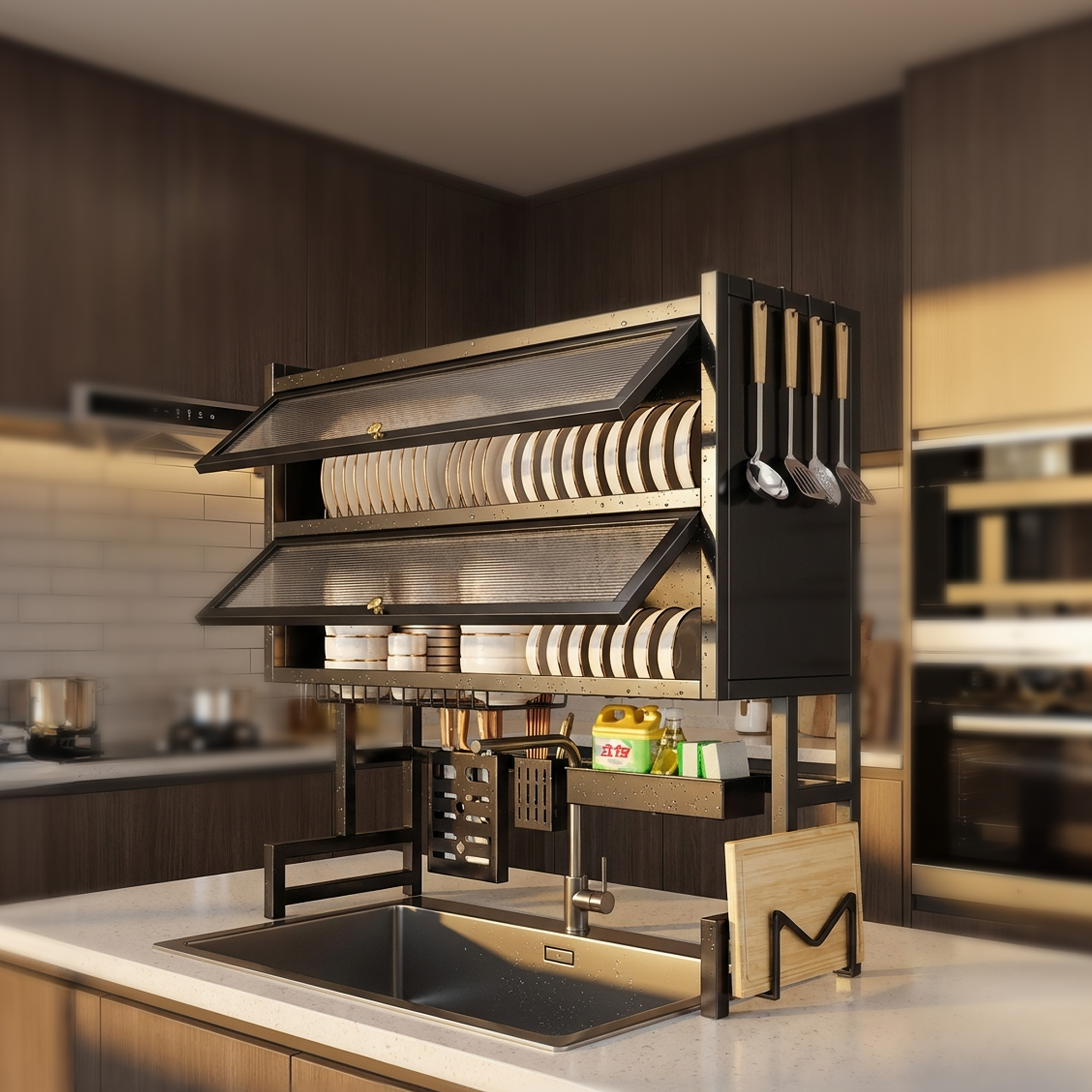 زاوية استغلال المساحة يستغل المساحة فوق الحوض ويحرر سطح المطبخ.